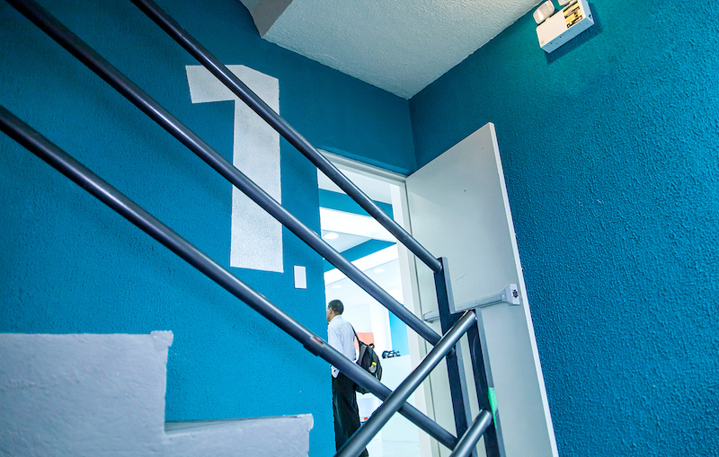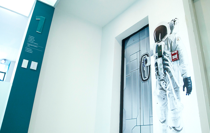 由于克鲁格公司想要让环境带给员工快乐和传达企业的文化,Mateo Flandoli解决方案则是用醒目的颜色来传达。建筑物的每个楼层被分配到不同的颜色,标识由透明丙烯酸类的数字加入环境光与颜色组合,每层楼的楼梯墙面也被刷成了其楼层的代表色。其次是将现代影像应用在电梯门上,能够结合楼层鲜艳的色彩,富有创意并且起到了装饰作用。在icon设计上,使用圆润的线条,视觉上舒适温和。该导视创造环境的图形给员工带来了欢乐并且可以改善企业员工的情绪,兼具友好、组织性和功能性,整套导视系统整洁,信息指向明确。