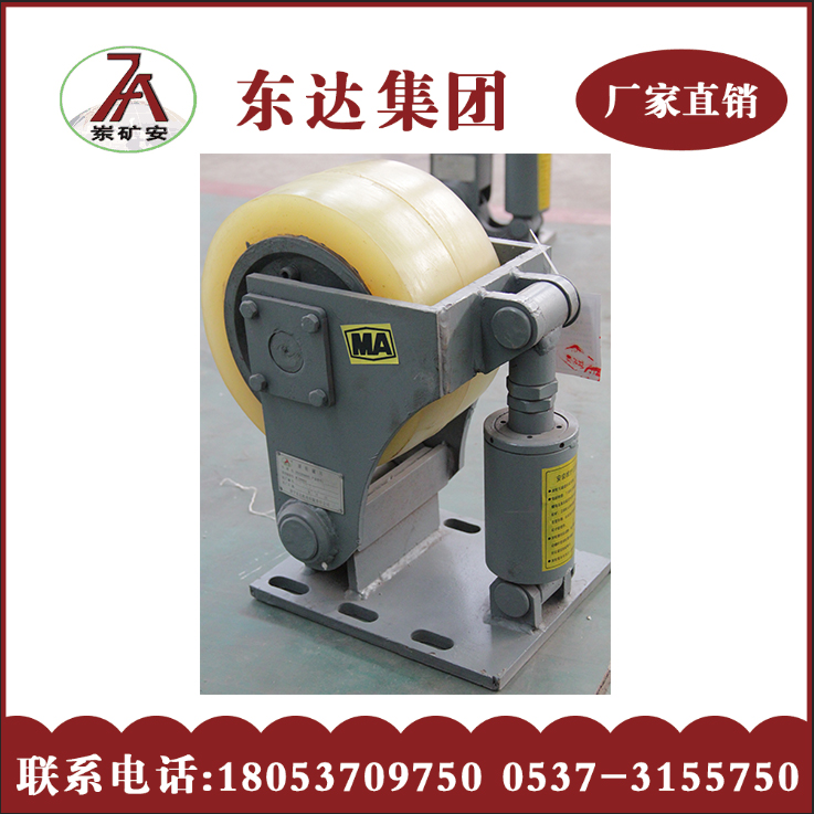 滚轮罐耳为一种立井提升容器用滚轮罐耳,其结构由底座、摆转臂、滚轮、缓冲器组成;滚轮罐耳结合我国矿山特点为目前运行中的提升容器更换新型滚轮导向装置提供了便利条件,广泛应用与矿山,煤炭等工业生产部门。罐道与罐耳由滑动摩擦变为滚动摩擦,因此减少了动力消耗,降低了噪音,罐道和罐耳的磨损也大大降低。从而,提高了罐道和罐耳的使用寿命。