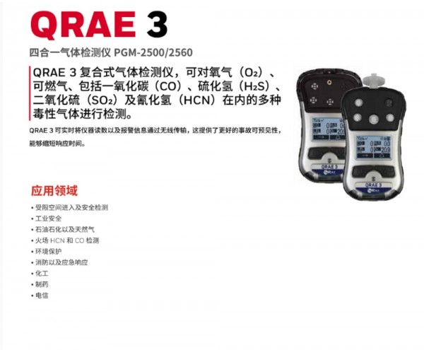 QRAE3复合式气体检测仪,可对氧气(O2)、可燃气、包括一氧化碳(CO)、硫化氢(H2S)、二氧化硫(SO2)及氰化氢(HCN)在内的多种毒性气体进行检测。