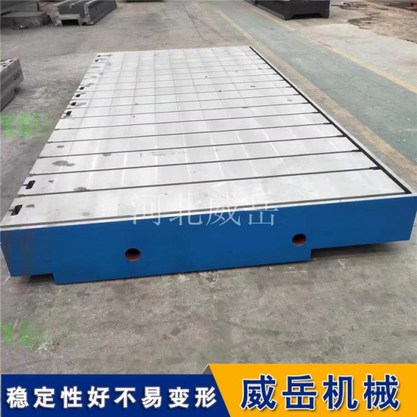 铸铁平台又叫HYPERlink "http://www.chinaweiyue.com/" T型槽平台是一种表面带有T型槽的HYPERlink "http://www.chinaweiyue.com/" 铸铁平台,用于装配、调试机械设备的铸铁平台量具,铸铁T型槽平台和划线平台一样严格执行国家相关行业标准,使用高强度铸铁铸造,不仅精度稳定,而且坚固耐用。工作面一般有T型槽,也可以根据要求加工长孔和圆孔,这种T型槽平台采用的是纯铁铸造而成的。有的铸铁T型槽平台工作面采用的是刮研工艺,用涂色的方法进行检验,保证了平面的精度。T型槽平台广泛应用在动力机械设备的装配、调试、焊接、铆焊,这种产品表面带有T形槽,可以固定机械设备。T槽型铸铁平台是一种专门用于辅助机床工作的台面,具有T型槽设计,便于工件的固定和定位。它广泛应用于试验、检测、测量及划线等多种工业场景,是摇臂钻床、车床、数控铣床等设备的理想配套工作台。从特性上来看,T槽型铸铁平台具有刚性大、硬度好的特点,其工作面硬度通常在HB170-240之间,不易磨损,能够长时间保持高精度。一般采用HT200-300铸铁,经过铸造、退火、人工刮研等精细工艺处理,确保了平台的稳定性和耐用性。