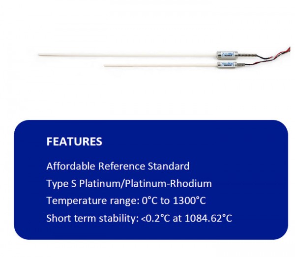 AM1210 参考标准 S 型热电偶由参考级铂和铂铑合金制成。它的温度范围为 0°C 至 1300°C,短期稳定性 <0.2°C,一直到铜的凝固点 (1084.62°C)。它通常用作校准工业热电偶的参考标准。所有热电偶线和零件在组装前都经过专门清洁和退火。每个 AM1210 热电偶在组装后均经过完全退火并再次测试,以满足以下规定的公差标准: