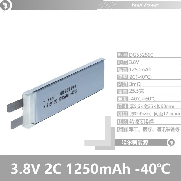 低温-40°聚合物锂电池电芯D552590 3.8V 2C 1250mAh低温特种锂电池