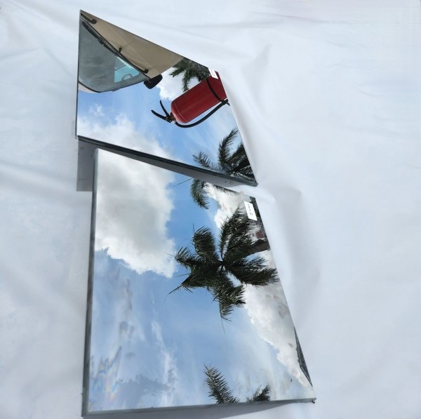 正品单向透视玻璃,由于玻璃表面有金属介质物存在,玻璃平放桌面,常规的肉眼可以清楚看到纯银色镜面膜层存在,当物体靠近时,有直观且清晰的影像显现在镜面表面。次品单向透视玻璃,因为镜面层夹胶在两片玻璃中间,其肉眼观察的结果,左右两面玻璃的影像没有任何差别,影像暗淡无光泽。