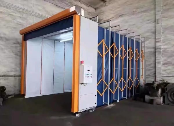 工作原理:移动伸缩前室由钢架结构和阻燃PVC布组成,通过平行四边形连杆机构或轨道驱动系统实现自动展开与合拢。工作时,前室沿轨道平滑移动至工件上方,形成封闭/半封闭空间进行喷漆;完成后收缩至一侧,节省空间并实现多工序共用场地。其核心系统包括: