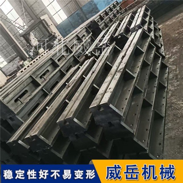 铸铁地轨--T型槽地轨主要用于大型设备的装配、试验、焊结和检验.这样不用做成大型的平台,地轨具体规格可根据需方图纸制作或双方商定生产加工。根据设备的固定点来设计、拼接成铸梁平台。即节省了材料成本,又可以占用很小的空间,可谓是性价比很高。完全可以替代大型装配平台、焊上平板、装配平板等,能够满足冶金设备、建材设备、矿山设备、造船等大型设备制造、组装、装配等工作。高度铸铁HT200-300工作面硬度为HB170-240经过两次人工处理(人工退火600度-700度和自然时效2-3年)使该产品的精度稳定,耐磨性能好。铸铁地轨长度规格可以做成500mm4000mm以内的各种规格。外形尺寸、每米长度重量要根据客户要求承重来确定,威岳公司免费为客户设计图纸、提供前期服务!多年来,我公司以合理的报价、高品质的产品、周到的售后服务赢得了市场的信誉。同时为了方便用户,可根据客户要求加工订做各种铸件、非标准量具地梁、T型槽铸铁地轨、十字槽铸铁平台、铸铁试验平台等产品。